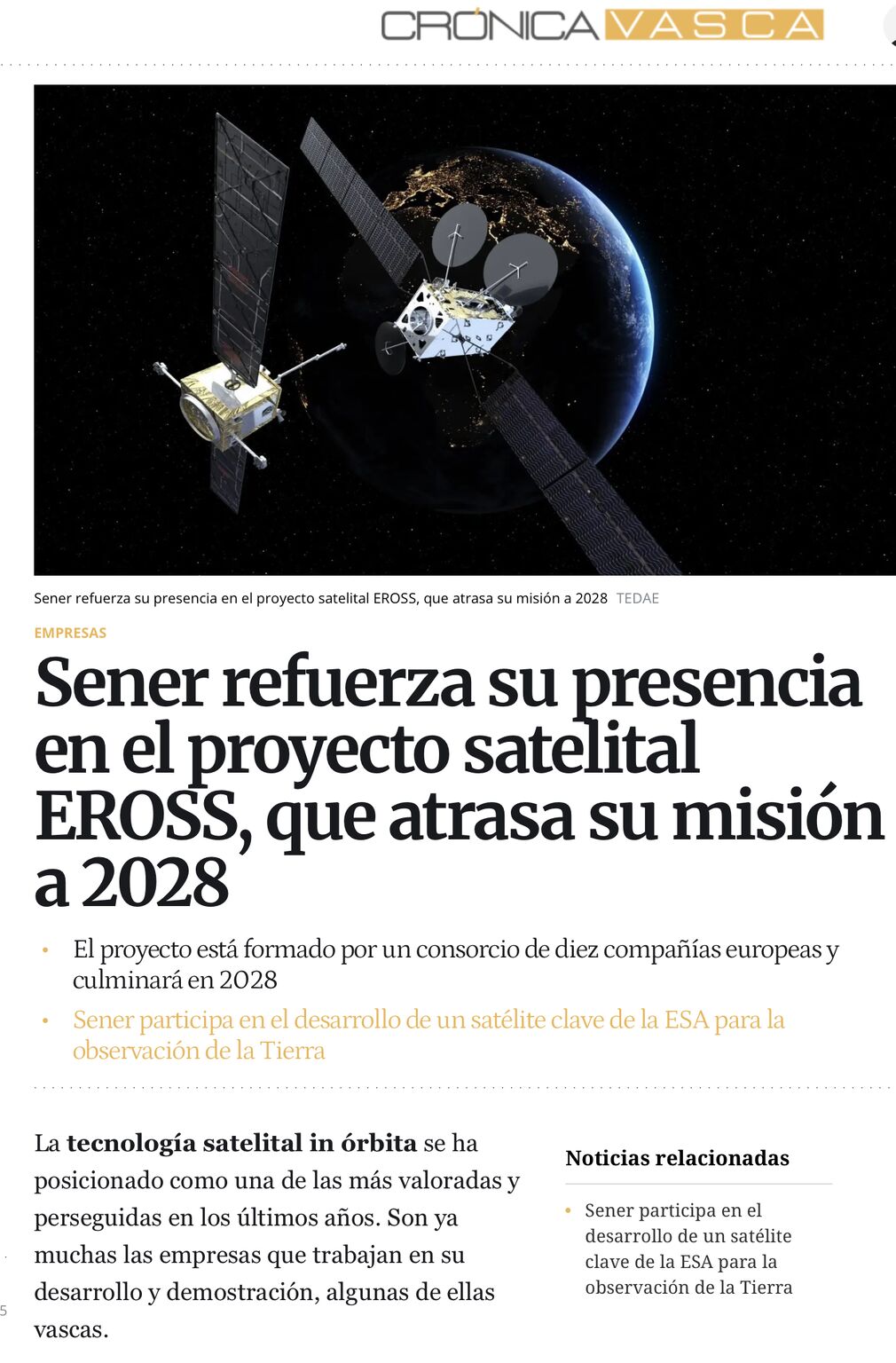 Our partners Sener Aerospace & Defence and our EROSS were featured in the Crónica Vasca Basque news outlet.